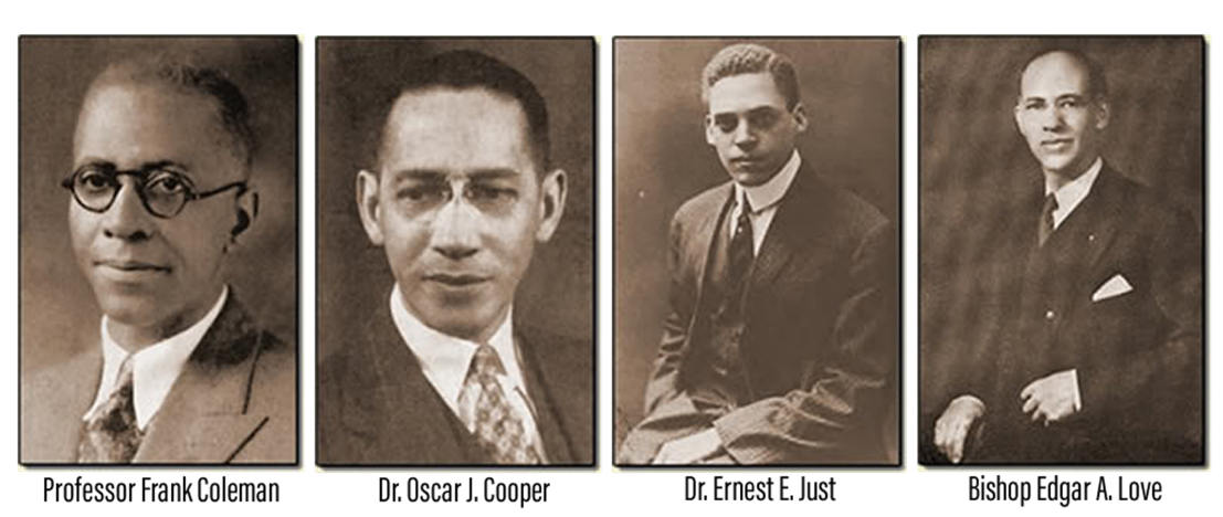 “Omega Dear,” was adopted as the official hymn in 1931. Charles R. Drew, professor of surgery, and Mercer Cook, professor of languages, both members of the Howard faculty, were the composers. Cook wrote the music and first stanza; Drew wrote the last two stanzas. By mid-1930, President Franklin D. Roosevelt created the Federal Council of Negro Affairs or “Black Cabinet,” which was an informal group of African-American public policy advisors who were organized to help the country emerge out of the depression. Omega men: Robert C. Weaver, Lawrence Oxley, Roscoe Brown, Frank Horne, William Hastie, J. Arthur Weiseger, Ted Poston, Campbell C. Johnson and William Trent were among those who served on the cabinet. Each of the founders graduated and went on to have distinguished careers in their chosen fields: Edgar Love became a bishop in the Methodist church; Oscar Cooper practiced medicine in Philadelphia for over 50 years; Frank Coleman became the chairman of the Department of Physics at Howard University and Ernest E. Just became a world-renowned biologist and the 1st recipient of the prestigious NAACP Spingarn Medal.